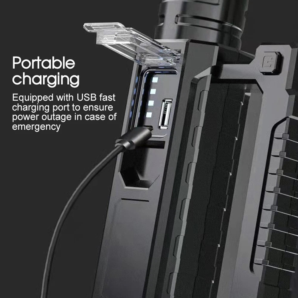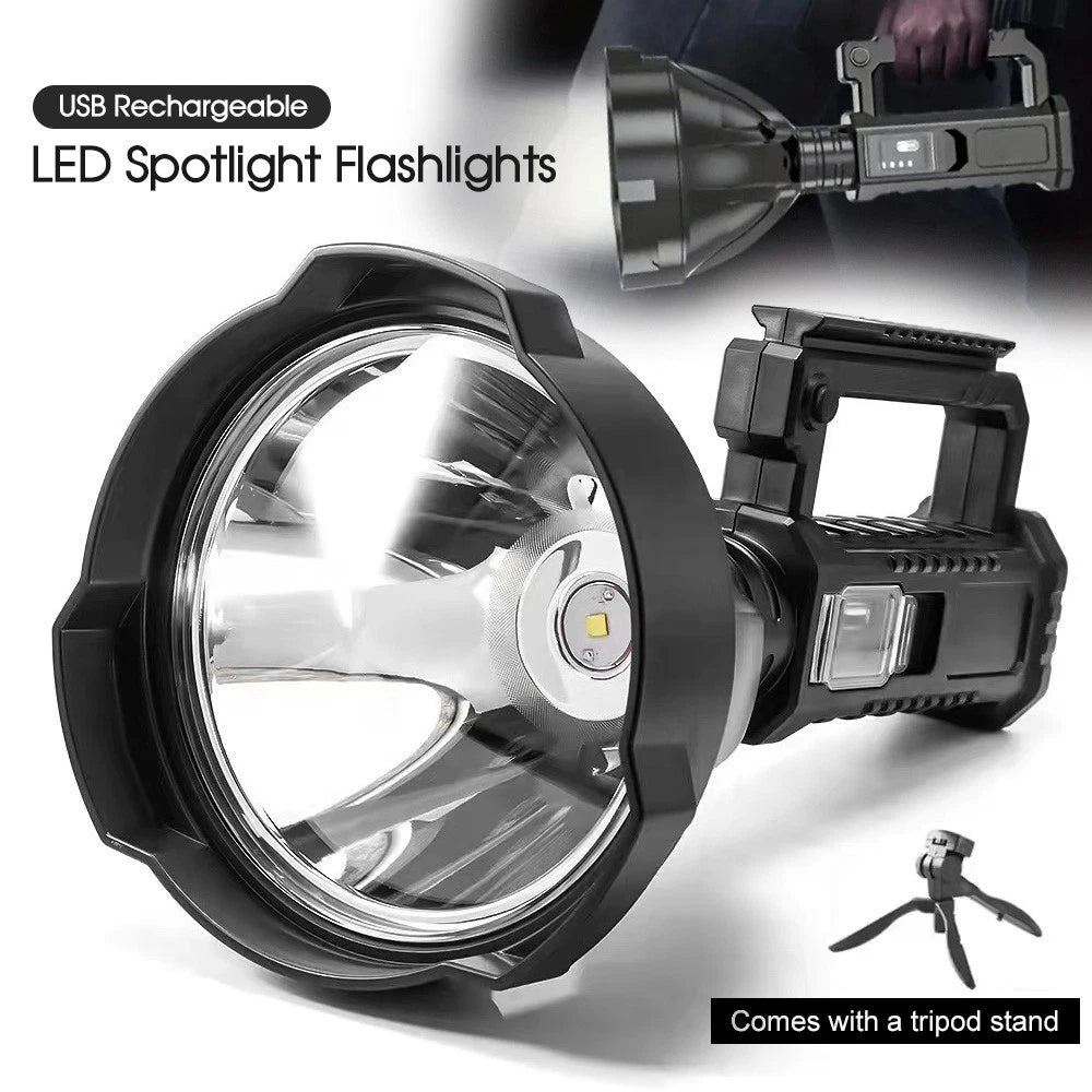 Light up your world with this ultra-powerful rechargeable LED spotlight, upgraded XHP50 LED wick. Perfect for outdoor adventures, emergencies, and everyday use, this high-performance torch is equipped with a removable tripod, USB input/output, and 4 lighting modes to suit any situation.